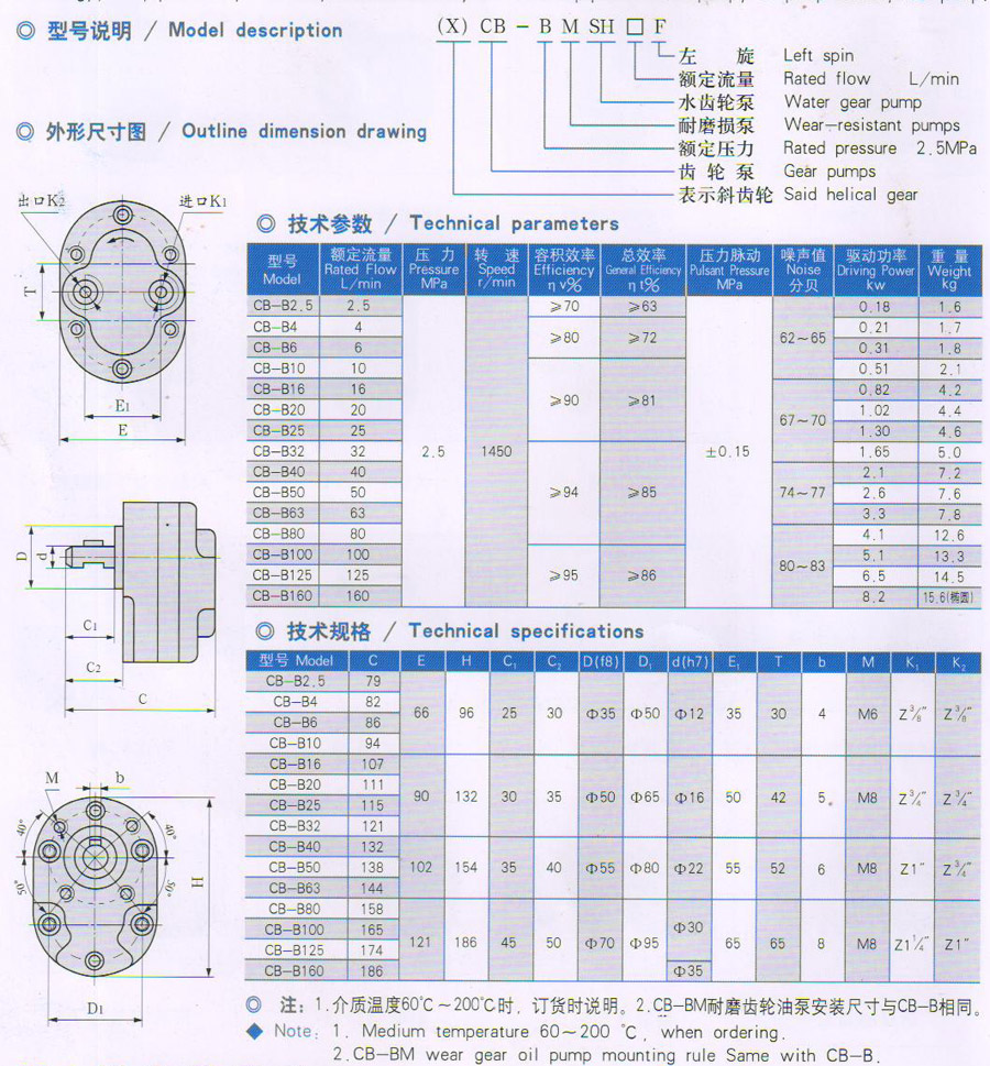 CB-B型低壓齒輪油泵1、概述: 本齒輪泵是將機械能轉換為液壓能的轉換裝置,廣泛應用于機床,工程機械的液壓系統,作為液壓系統的動力源,也可作為潤滑泵、輸油泵使用。