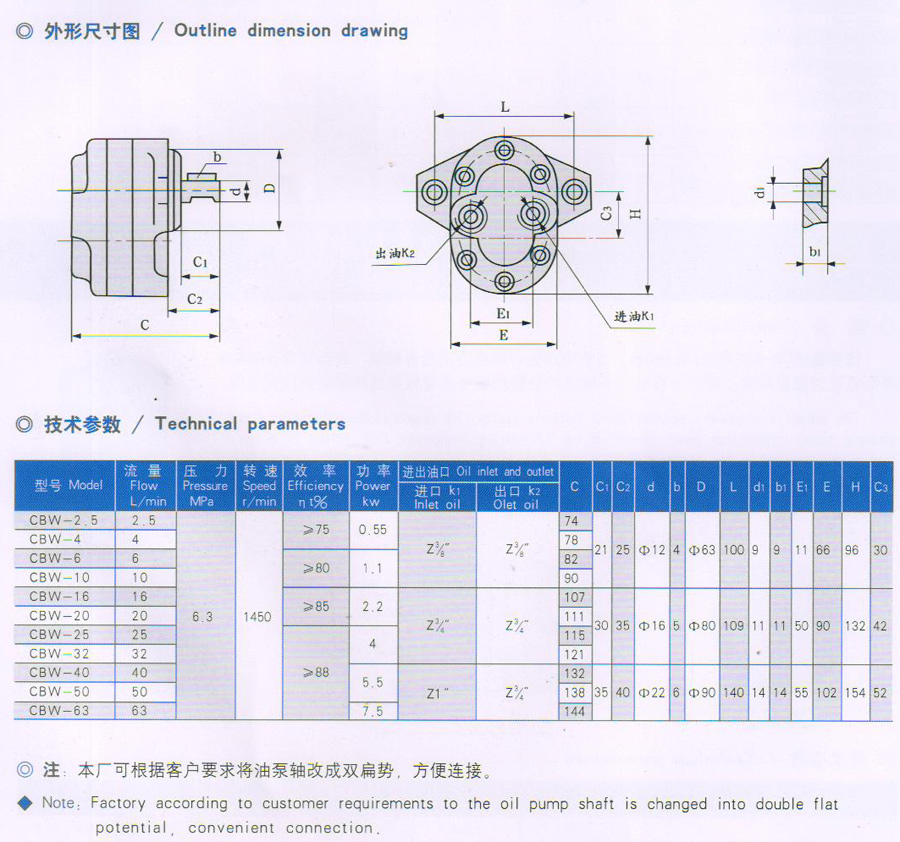 CBW表示齒輪泵的名稱。W這個(gè)位置該是表示壓力等級(jí)。不過(guò)齒輪泵的壓力等級(jí)分為:D 10MPA;E 16MPA;F 20MPA;G 25MPA。3是齒輪泵模數(shù),其模數(shù)又為分1,2,3,4,5.06是公稱排量。R表示法蘭安裝形式。O為菱形,R為距形,S為方形。F表示油口形式。F表示為法蘭,T表示為特殊,L表示為螺紋。P表示軸伸形式。B表示扁口,H表示花鍵,Y表示圓錐,P表示單鍵。旋轉(zhuǎn)方向:L表示為左旋,R表示為右旋,T表示雙向旋轉(zhuǎn)。